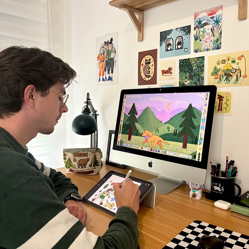 Koni Studio, de son vrai nom Nicolas Schmidt, incarne à merveille l’esprit d’une illustration nature colorée portée par un artiste amoureux de la montagne. Originaire de Saint-Brieuc et aujourd’hui installé dans les Alpes, Koni puise son inspiration dans les grands espaces, la faune locale, les balades en pleine nature et son fidèle chien Winnie, qui ne le quitte jamais.